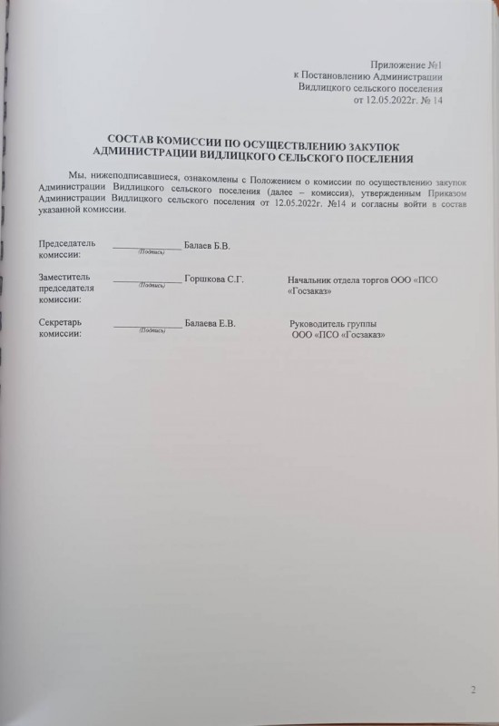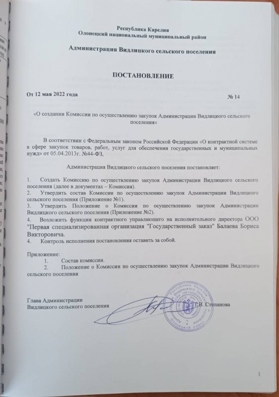 Положение утв. Постановлением администрации Видлицкого сельского поселения № 14 от 12.05.2022г. «О создании Комиссии по осуществлению закупок Администрации Видлицкого сельского поселения» (в ред. от 24.01.2023г. № 2а; от 02.02.2026г. № 4)